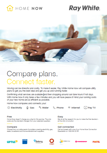 Moving can be stressful and costly. To make it easier, Ray White Home Now will compare utility plans to get you the best deal and get you up and running faster. Confirming what services are available and then shopping around can take hours if not days. With Home Now it only takes a few minutes and you will have peace of mind your running costs of your new home are as efficient as possible.